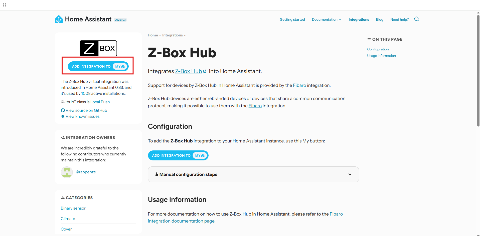1. Access the following link: https://www.home-assistant.io/integrations/zbox_hub/. This will take you to the screen below. Click Add Integration to My Home Assistant: